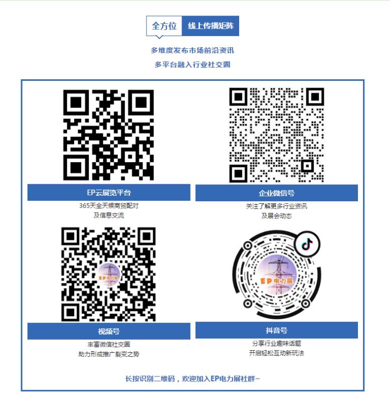 EP电力展聚焦电力行业高中低压全产业链需求, 展品范围包括中外最新电力设备、电力技术和电力系统,覆盖一站式输配电力设备、电力物联网、数字化电网、电力自动化、电力智能制造装备、检测及智能仪器仪表等。展会将汇聚电力业内来自电力公司、电力工程及建设、电力研究院及设计所、电力调度及控制中心、电力系统公司、供电局电力设备进出口公司、电力设备制造商、电力用户、工业用户等领域的观众前来参与。