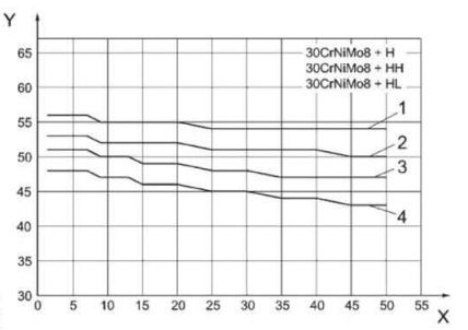 图中:X-离开淬火端距离/mm;Y-硬度HRC;1-硬度上限;2-HL等级的硬度上限;3-HH等级的硬度下限;4-硬度下限