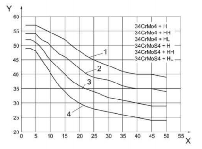 图中:X-离开淬火端距离/mm;Y-硬度HRC;1-硬度上限;2-HL等级的硬度上限;3-HH等级的硬度下限;4-硬度下限