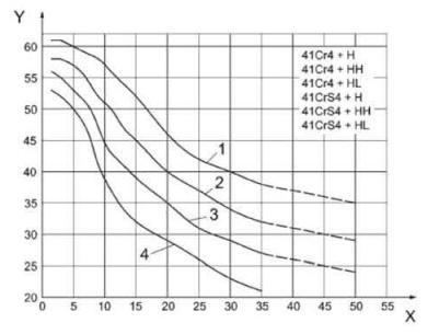图中:X-离开淬火端距离/mm;Y-硬度HRC;1-硬度上限;2-HL等级的硬度上限;3-HH等级的硬度下限;4-硬度下限