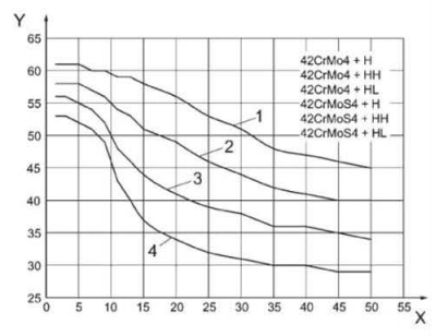 图中:X-离开淬火端距离/mm;Y-硬度HRC;1-硬度上限;2-HL等级的硬度上限;3-HH等级的硬度下限;4-硬度下限