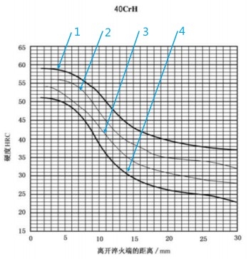 淬透性带范围(H/HH/HL)、离开淬火端的距离/mm、硬度HRC的关系图