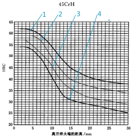 淬透性带范围(H/HH/HL)、离开淬火端的距离/mm、硬度HRC的关系图