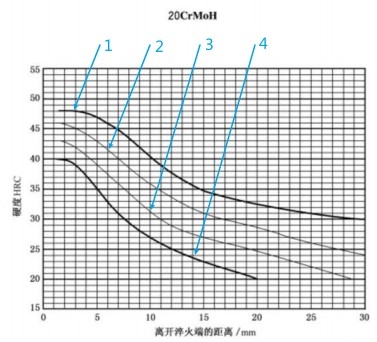 淬透性带范围(H/HH/HL)、离开淬火端的距离/mm、硬度HRC的关系图