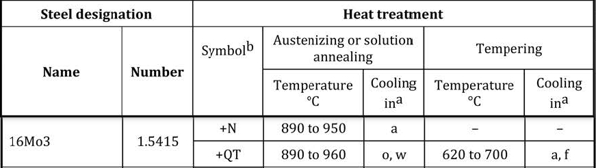 N = normalized; QT= quenched and tempered; a = air; f = furnaced; o = oil; w = water or water based medium.