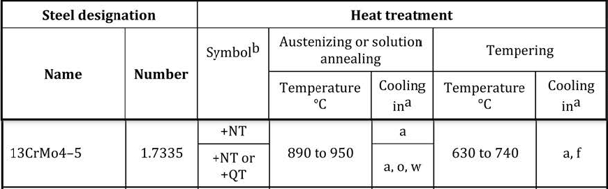 N = normalized; QT= quenched and tempered; NT= normalized and tempered. a = air; f = furnaced; o = oil; w = water or water based medium.