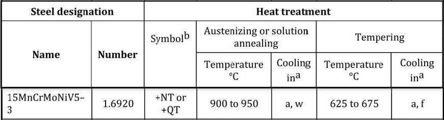 QT= quenched and tempered; NT= normalized and tempered. a = air; f = furnaced; w = water or water based medium.