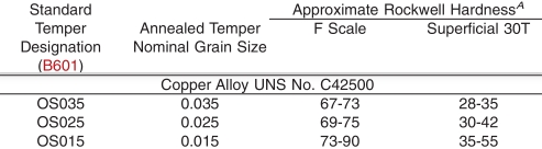 Rockwell hardness values apply as follows: The F scale applies to metal 0.020 in. (0.5 mm) in thickness and over; the 30T scale applies to metal 0.015 in. (0.38 mm) in thickness and over.